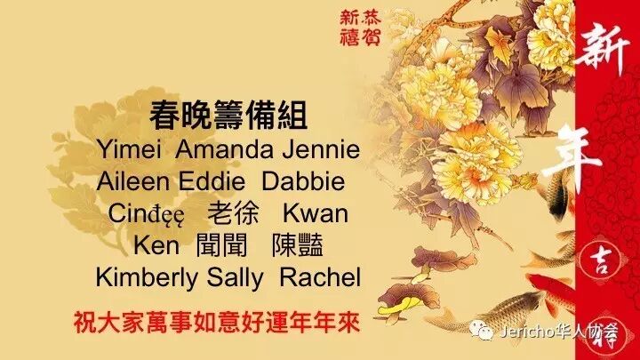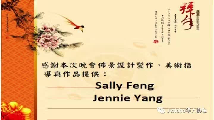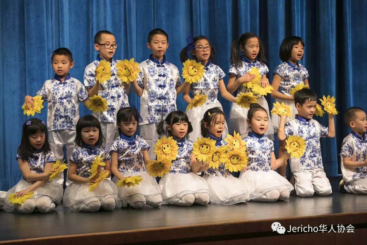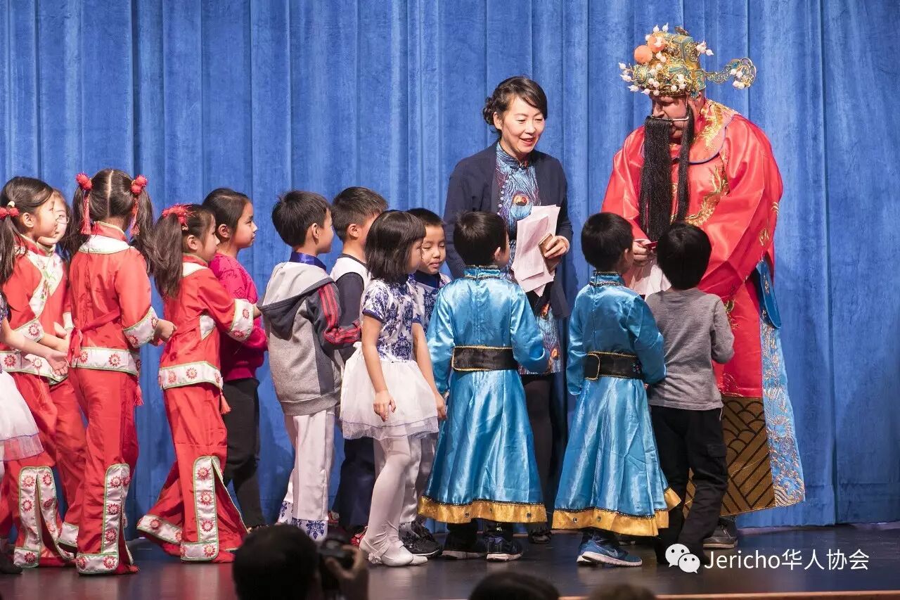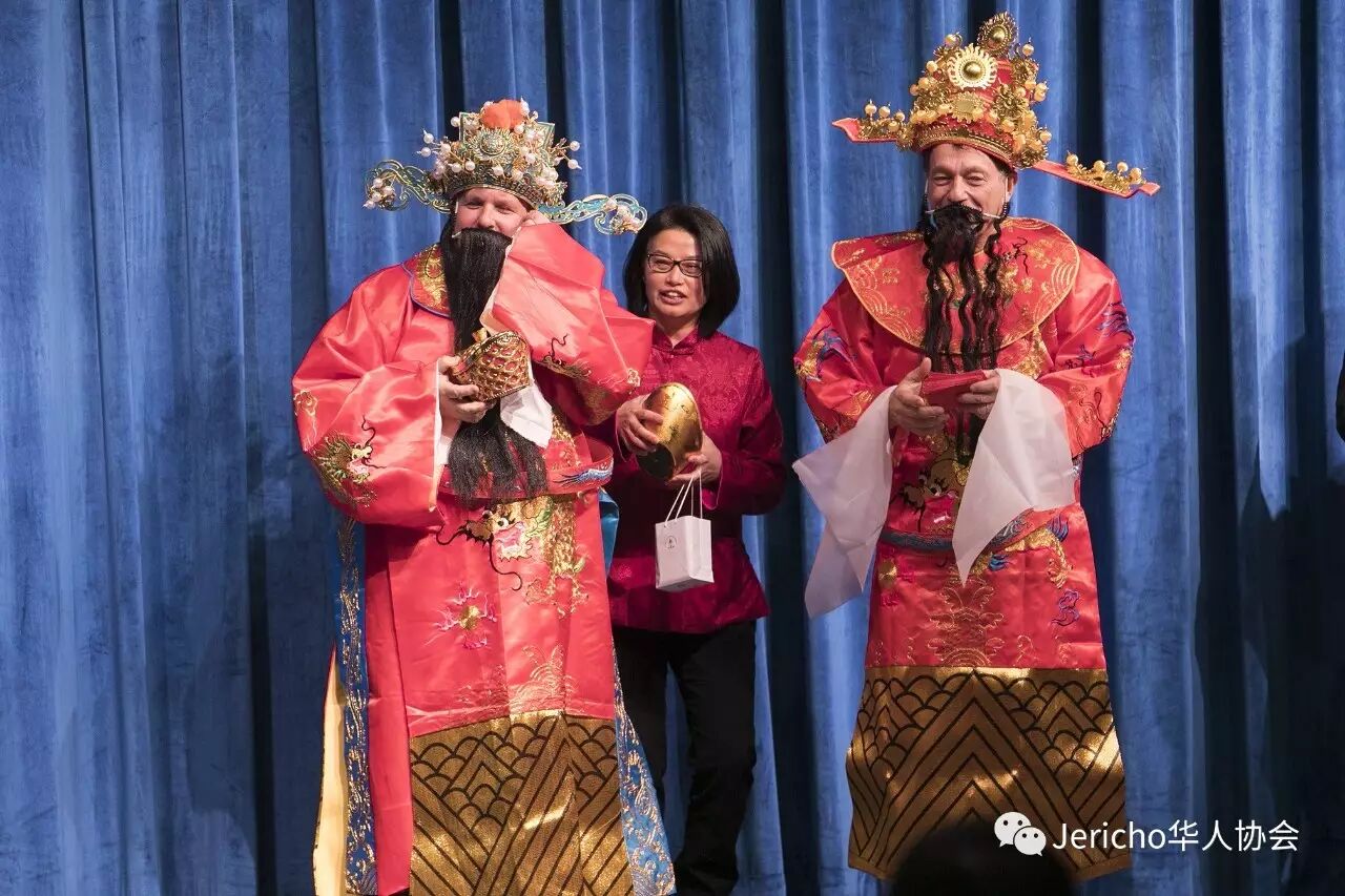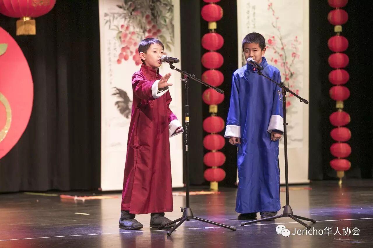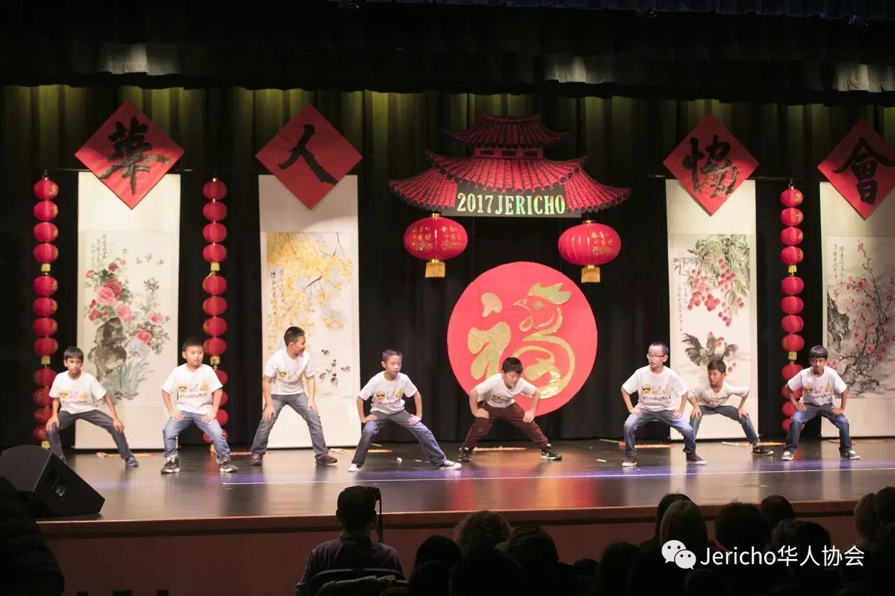 晚會節目由 Enson Pan、 Kaden Ho、Sean Zhang、Mathew Liang、Stephen Liang、Berry Zhang等八人的舞獅為春節晚會開場。祥獅獻瑞、彩鳳鳴春,寓意Jericho華人在今年都能事事順心,闔家平安。而後由一群漂亮的小姑娘帶來的紅綢舞更是喜氣洋洋,當鮮艷的紅綢隨隨著歡快的音樂在台上舞動,傳統新年的祝福也隨之飄散。幼童組的蒙古筷子舞更是萌度破表,讓在場來賓都甜在心裡,眼裡。隨後一群身穿藍白青花瓷風格的小朋友登場獻唱︰歌聲與微笑,當台上甜美的歌聲,和台下觀眾的微笑互相呼應時,儼然成為當晚最美的一道風景。