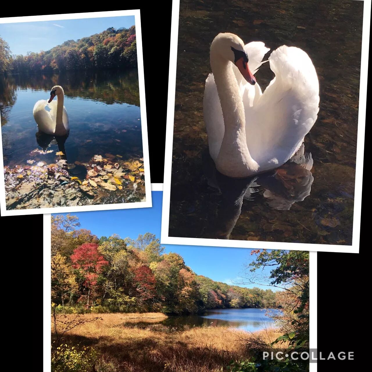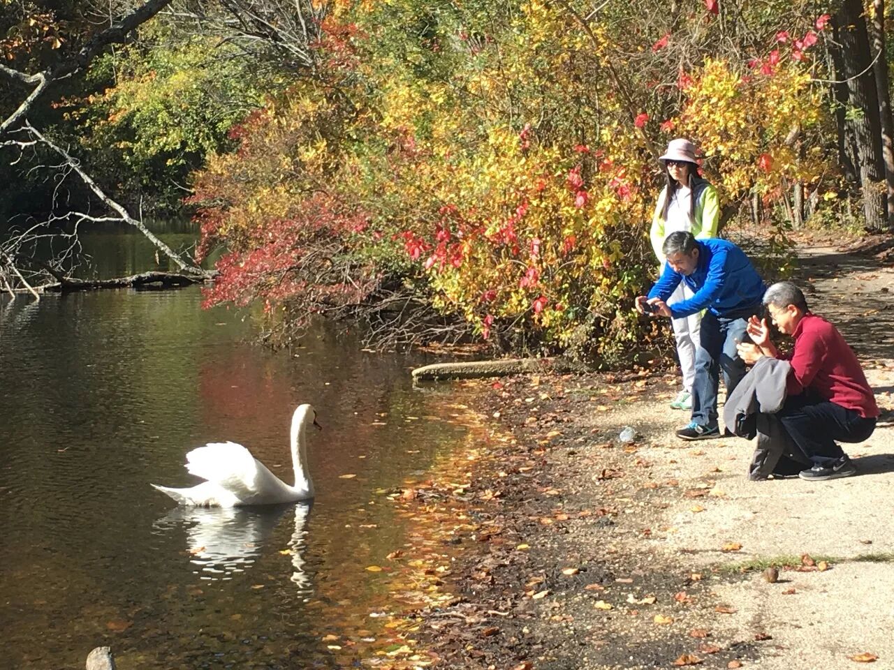 大家一路走一路聊,不到半个小时,第一段山路已经走完。爸爸们只觉得意犹未尽,几个妈妈也还想再探一程。于是分做两队,一队继续向前,而另一队早已盘算起要去哪里饱餐一顿。向前的一队不时发回天鹅湖的美景。高贵矜持的白天鹅轻轻划过水面,微微漾起的水波推开湖边积攒的秋叶。深浅不一的秋色间映出一抹淡淡的悠然。