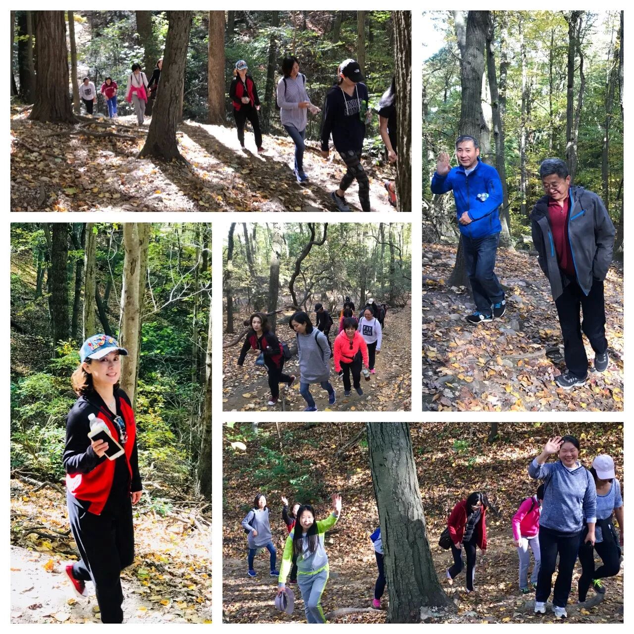 顾不得仔细欣赏那白色雅致的图书馆,大家一下车就汇集到山路的入口处。映入眼帘的满是诱人的秋色。一条原木铺成的小路蜿蜒而上,两边树木高矮参差,浅绿,深绿,淡黄,金黄,点点嫣红漫上叶尖,顽皮的阳光在枝叶间跳跃。相熟的人们热络攀谈,初识的则点头问候。没见过面的群友不时报着网名,手机微信中的名字终于对上了面前的笑脸。一边是老乡见老乡聊起家乡话就停不下来的亲热,一边是新居民找到老朋友的心安。“原来我们的孩子在一个班!” “原来我们住的只隔了一条街!”